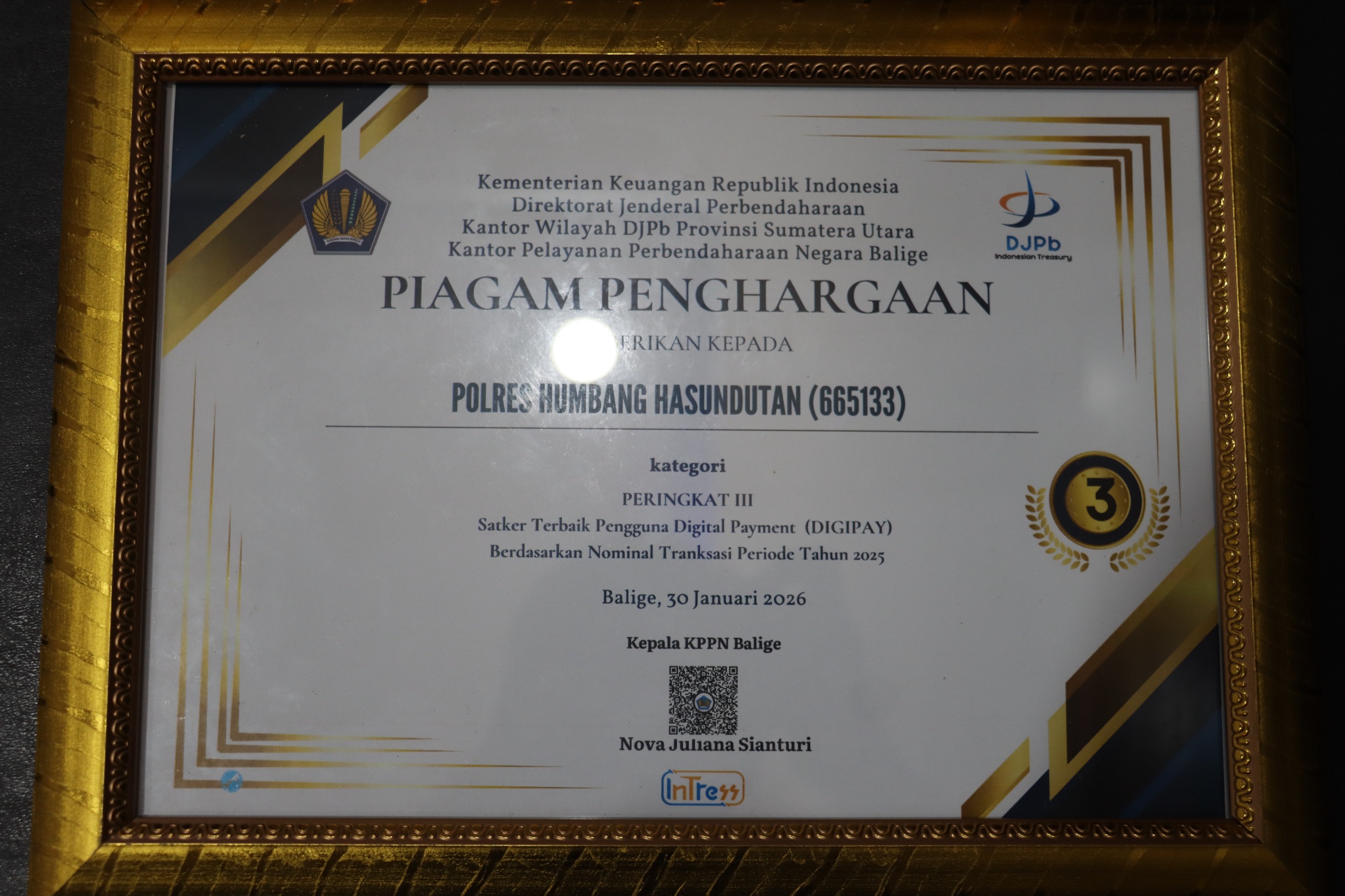 Adapun dua penghargaan yang berhasil diraih Polres Humbahas, yaitu Peringkat Kedua Satuan Kerja Terbaik Pengguna Digital Payment (DIGIPAY) berdasarkan Jumlah Transaksi Periode Tahun 2025 dan Peringkat Ketiga Satuan Kerja Terbaik Pengguna Digital Payment (DIGIPAY) berdasarkan Nominal Transaksi Periode Tahun 2025.